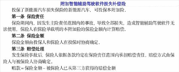 此外,意见稿中还有附加智能辅助驾驶软件损失补偿险。保险责任为,在主险责任范围内的事故,导致全部损失,造成智能辅助驾驶软件无法使用,保险人在保险单载明的本附加险的保险金额内计算赔偿。也就是说,如果车辆因事故导致全损,而此前车主单独购买的智能辅助驾驶功能无法使用(车辆全损后,保险公司回收后全额理赔),也会对其进行保险赔付。