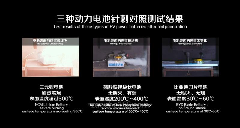 针刺测试的结果对比明显,比亚迪刀片电池针刺后,无明火、无烟,表面温度仅为30-60℃。普通磷酸铁锂电池针刺后,无明火,冒烟,表面温度200℃-400℃。三元锂电池针刺后,剧烈燃烧,表面温度超过500℃。