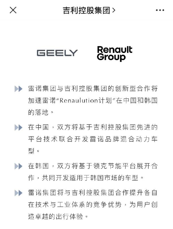 8月9日,吉利官方对外宣布,吉利控股集团与雷诺集团签署谅解备忘录 ,在中国和韩国开展合作。