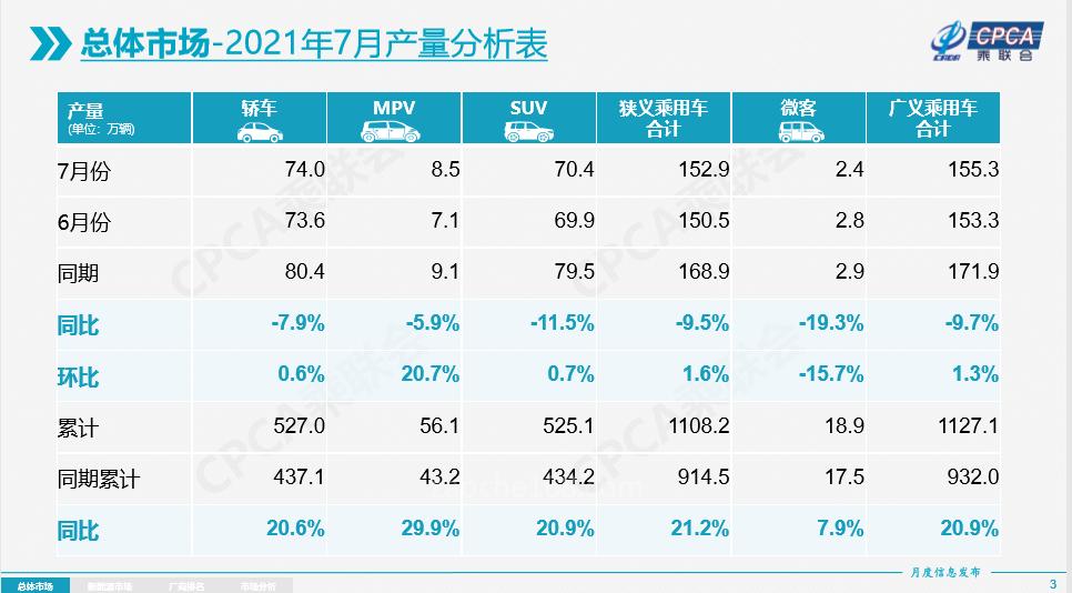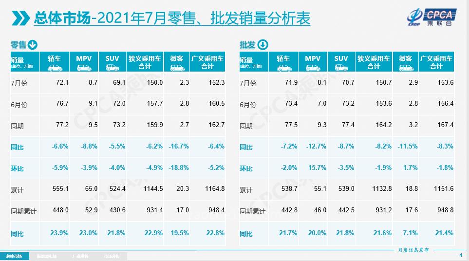 乘联会秘书长崔东树指出,7月车市是传统意义上的淡季,但产量表现较为突出,相较6月份环比呈上升态势;7月狭义乘用车零售和批发销量相比去年同期呈下滑趋势,主要是由于去年下半年车市处于疫情平稳后的爆发期,这种高基数对今年下半年的车市造成一定压力。崔东树还强调,近期国际芯片供应不足给中国部分车企带来了严重损失,比如部分车企近几个月批发端销量骤减,使得经销商进出不均衡、订单需求与现有库存不匹配等现象时有发生,这也导致了整体车市零售偏弱的现象。