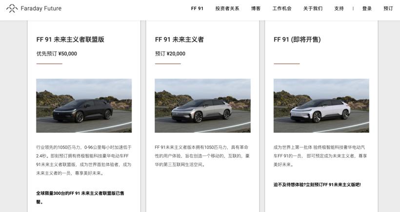 虽然还未实现量产,但上市三天后,贾跃亭就在社交平台上透露,截至当天早上,全球限量的300台限量版FF 91 Futurist Alliance Edition(未来主义者联盟版)已经被抢购一空。根据FF的官方信息,FF 91将会以18万美金起售,国内的价格加上关税将达到200万元以上。