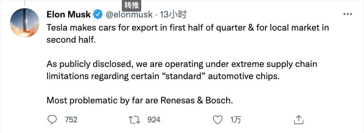 8月12日,马斯克在Twitter上回应方舟投资管理公司首席执行官Cathie Wood时表示:“在某些‘标准’汽车芯片方面,我们遭遇了极端的供应链限制。迄今为止,存在最多问题的供应商是瑞萨和博世。”