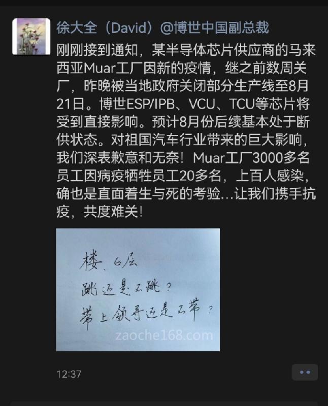 8月17日,据博世(中国)投资有限公司执行副总裁徐大全透露,由于马来西亚疫情严重,某半导体芯片供应商的马来西亚Muar工厂继之前数周关厂,再度被当地政府要求关闭部分生产线至 8月21日,这将导致博世ESP/IPB、VCU、TCU等芯片受到直接影响,预计8月份后续基本处于断供状态。
