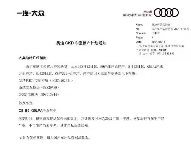 8月18日,一份一汽-大众奥迪致特许经销商的“奥迪CKD车型停产计划通知”在网络上流传,这份通知显示,由于车辆主控芯片持续缺货,从8月12日起,B9产品线开始停产;8月13日起,Q5L PA产品线开始停产;8月25日起,C8产品线开始停产。