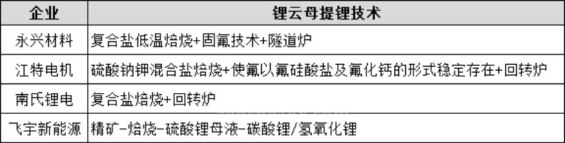 目前包括永兴材料、江特电机、南氏锂电主要采用复合盐低温焙烧法,飞宇新能源则是采用锂云母矿高温焙烧,通过制成锂母液制备碳酸锂。