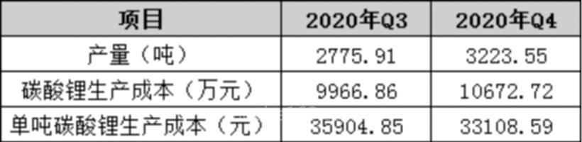 根据永兴材料2020年年报显示,2020年Q3碳酸锂产线达产以来,至Q4碳酸锂成本已降至3.3万元/吨,季度产量提升至3223.55吨。