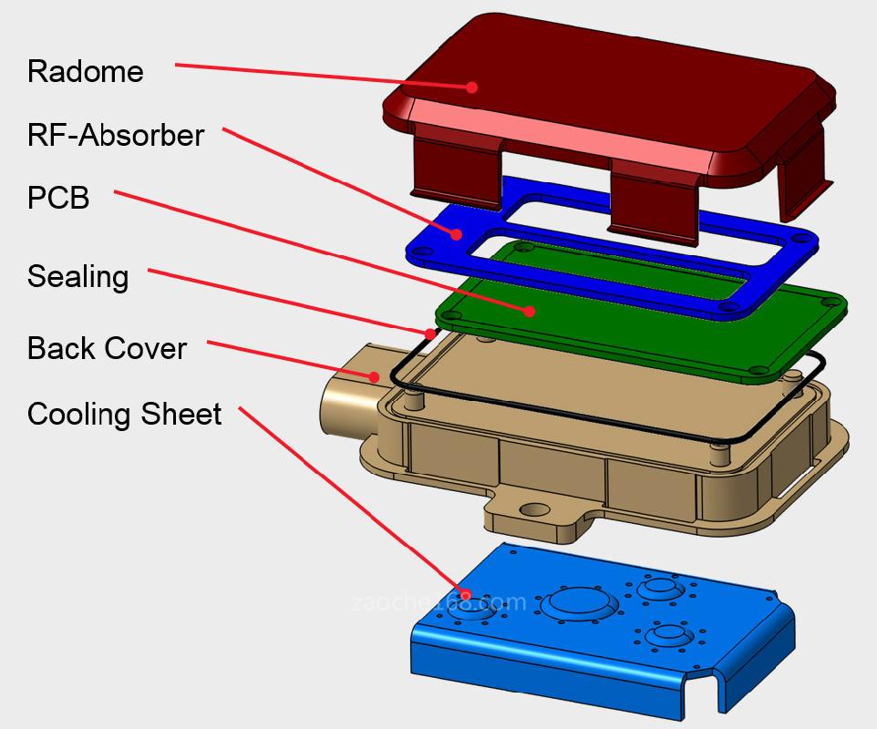朗盛新概念包括以下单个组件:前盖(天线罩);雷达吸波器;印刷电路板(PCB),包括天线;和带有集成冷却元件的后盖。天线罩由塑料制成,背对车辆,可高度传输雷达波。而聚对苯二甲酸丁二醇酯(PBT)具有较低的介电常数(Dk)和损耗因子(Df),因此非常适合这种应用。