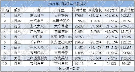 具体来看,上半年以大比分优势夺得半程销冠的轩逸,7月再次以3.7万辆的成绩蝉联月度冠军。业内人士表示,轩逸的智能化程度相对较低,受“缺芯”的影响较小,不过由此带来的影响正逐渐显现。轩逸当月销量同比下降16.21%,环比下降21.61%。