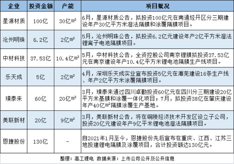 高工锂电注意到,从年初以来,头部动力电池企业密集扩产启动,为了匹配电池端需求,隔膜企业纷纷宣布扩产。