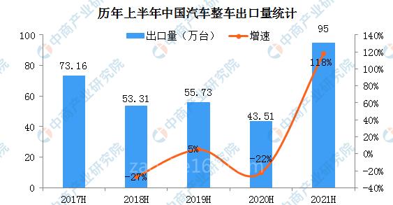 近几年我国汽车出口形势良好。2019年整车出口122万辆,2020年受新冠疫情影响出口量同比下降了13%,只有106万辆。但2021年上半年,汽车市场趋于稳定,汽车整车出口量95万辆,在去年同期低基数基础上实现了翻番,几乎触碰到了百万辆级别。