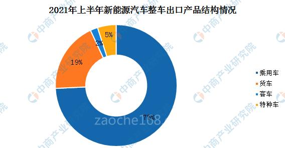 而新能源汽车整车出口又以乘用车为主,2021上半年乘用车整车出口占比75%,货车整车出口占比19%,客车整车出口占比2%,特种车整车出口占比5%。