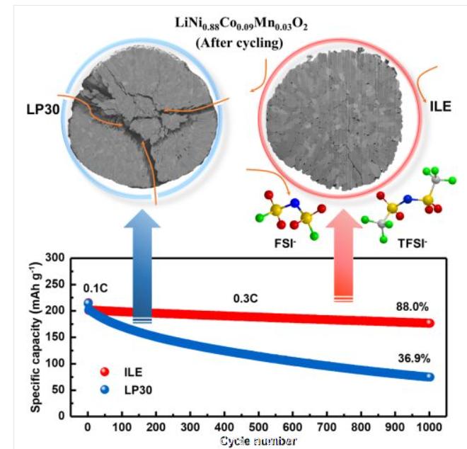 因此,研究人员使用了一种具有两个阴离子的离子液体电解质 (ILE)。借助于非挥发性、不可燃的ILE,可以明显减少富镍正极中的结构变化。