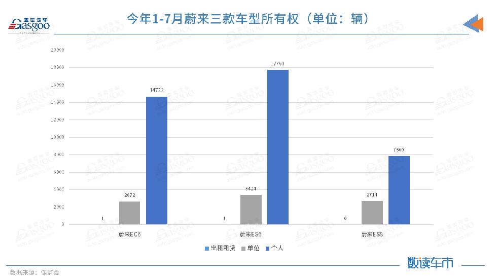 除个人用户以外,蔚来今年前7月的单位用户上险量为8810辆,占比17.92%;出租租赁上险量仅有两款,占比不到0.01%。在车型方面,蔚来ES6、EC6的个人用户占比均为84%,ES8的个人用户占比为74%。由此来看,蔚来三款车型中,定价低于ES8的ES6和EC6更受个人用户的青睐。