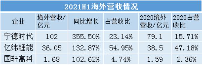 近期,各大动力电池企业相继披露半年报。高工锂电注意到,宁德时代、国轩高科、亿纬锂能2021年上半年境外营收出现翻倍式增长,同比增速在1~3.5倍,境外营收接近或已超过2020年全年。