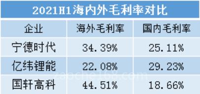 就毛利率来看,宁德时代、国轩高科海外毛利率超过国内,其中国轩海外毛利率达到44.51%,较国内业务高出近26个百分点。