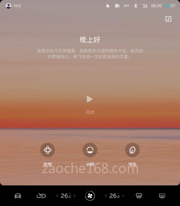 潮汐是一款著名生活健康应用App。蔚来基于用户在车内空间的真实使用场景需求,推出车内潮汐应用。潮汐应用提供小憩、冥想与呼吸三种模式,通过融合沉浸式背景音(支持5.1声道)及联动座椅、空调、灯光、音响等设备,打造更舒适惬意的车内空间。