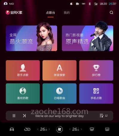 全民K歌是一款广受欢迎的手机K歌交友软件。为使车内的娱乐体验更加丰富有趣,蔚来推出车内卡拉OK应用“全民K歌”。全民K歌拥有超过1000万首的海量曲库,除屏幕操作点歌外,还支持在车上QQ音乐界面跳转点歌、手机扫码点歌。