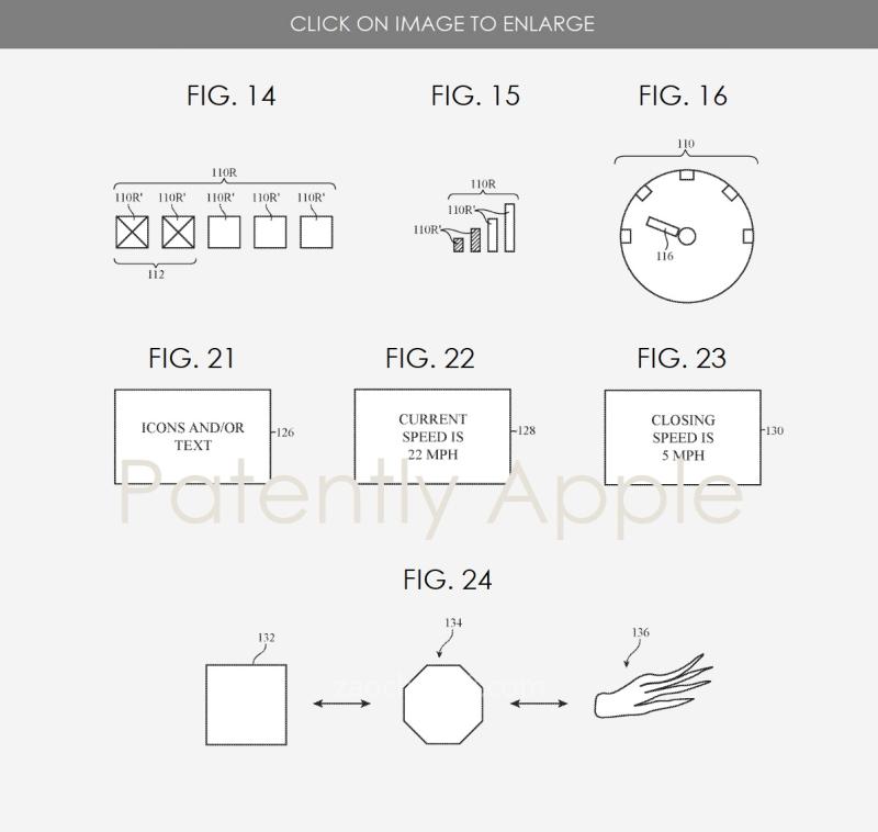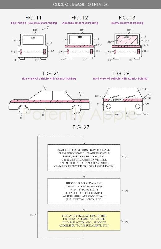 苹果专利图11-13展示了一种更具交流性的方式,其中表现了在任何时间点应用于车辆的不同级别的刹车;图25和26展示了带有外部照明的说明性车辆的侧视图,其中一个附加文字;图27是在产生基于光的警告和其他输出的同时,控制车辆和相关系统所涉及的说明性步骤的流程图。