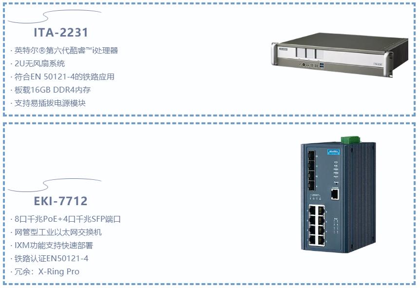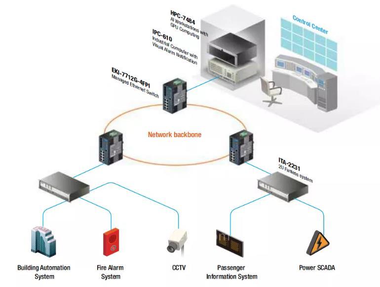 研华提供了两种产品:无风扇可扩展机架式工业计算机ITA-2231,以及可提供多种接口和高速连接的网管型以太网交换机EKI-7712。地铁的综合监控系统必须提供两级管理控制机制,ITA-2231作为前端处理器(FEP)和位于不同位置的转码器实现了全面监控,以提供灵活的接口。同时,EKI-7712帮助ISCS快速、安全地访问承载网络。因为它是一个可控通信设备,具备安全隔离和防护功能。