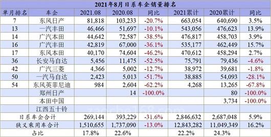 数据显示,过去与德系二分天下的日系品牌,在8月份份额跌到了17.8%,与去年同期相比直接少掉14万辆,仿佛又被打回了原形。体现在批发销量和同比层面,“两田”和日产纷纷挂上了同比两成以上的跌幅,当然最重要的锅还是要供应链体系来背。