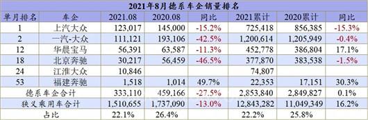 日系遭遇滑铁卢,德系同样也不轻松,8月份德系的市场份额依然只有22.1%,离四分之一还有一段距离。过去上汽大众在德系品牌中拖后腿,现在轮到一汽-大众,8万辆的同比跌幅,让一汽-大众也体会到了摔跤的痛楚。