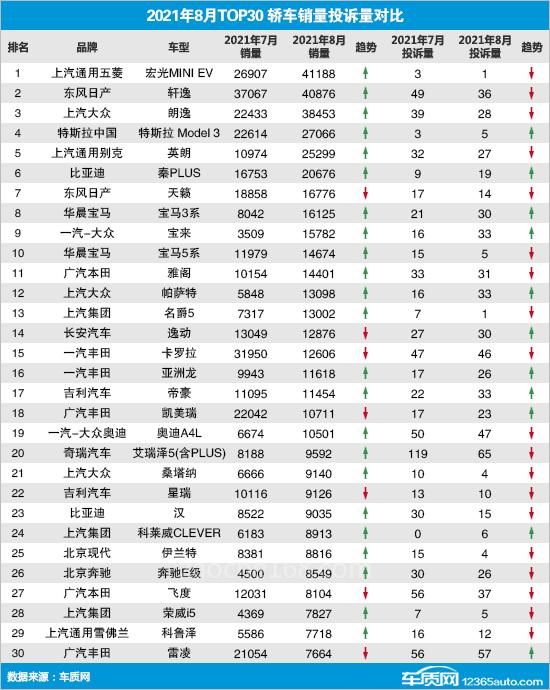 8月份,在质量问题中,排名前三位的故障问题均来自于车身附件及电器,其中“仪表台开裂”成为本月投诉量最高的故障问题,环比上涨29.3%,投诉增量来自于部分日系品牌热销车型。“车身生锈”问题8月份投诉突破200宗,排名跃升至第三位,投诉量较上月上涨11.4%,投诉多来自于部分自主品牌热销车型。此外,“转向系统异响”和“部件开裂”投诉量较上月出现小幅增长。在服务问题中,“系统升级问题”投诉量较上月出现明显增长,环比暴涨约2.5倍。去除投诉人自愿申请撤诉的信息后,2021年8月TOP30轿车销量投诉量排名如下: