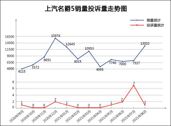 在2020年11月被成功“复活”后,凭借运动化的造型和更受国人喜爱的三厢车结构,名爵5的市场表现一路飘红,已成为上汽名爵最重要的销量担当。今年1-8月,名爵5累计销量71,667辆,稳居上汽名爵各车型之首,在上汽名爵同期总销量中的占比超过1/3。从其近一年来的销量投诉量走势图来看,在2020年12月销量冲顶后,名爵5经历了近半年的调整期,8月份销量时隔四个月再次冲破万辆大关,达到了近一年来的第二高点。反观其月投诉量,始终保持在个位数水平,近半数月份实现了“零投诉”,短期内的质量口碑值得肯定,望再接再厉。随着销量再次冲高,以及稳定的质量口碑表现,名爵5有望进入新一轮的销量增长周期。