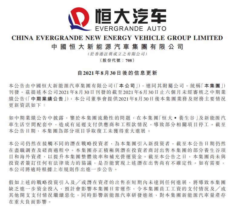 9月24日晚间,恒大汽车(00708.HK)在港交所公告称,鉴于集团流动性的问题,在集团恒大养生谷及新能源汽车生活空间配套中,造成有延迟支付供应商和工程款情况,导致部分相关项目停工。