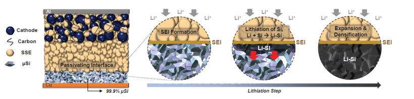 作为下一代电池产品——全固态电池是将电池正极和负极之间的电解质从液态变为固态,相较现在主流的锂离子电池具备更高能量密度、更高安全性的优势,可广泛应用在新能源汽车、储能领域。之前的全固态电池为了提高能量密度使用锂金属作为负极,但由于对温度敏感,只能在60℃以上的高温环境中充电,并且存在充电速度缓慢的技术瓶颈。为了突破这一难题,LG新能源研发团队去除了全固态电池负极中的导电材料和胶粘剂,采用了5 um(微米)左右颗粒大小的"微硅负极材料"。