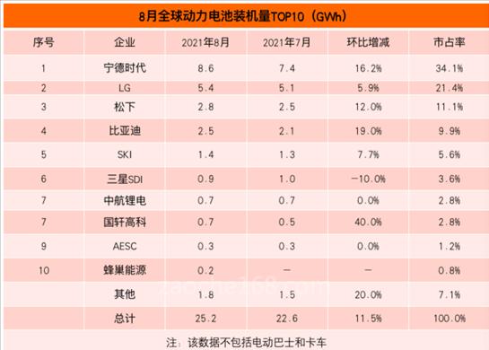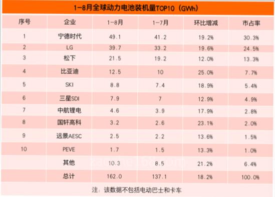 8月,宁德时代继续高歌猛进,稳坐冠军宝座,LG、松下分列季军和亚军。正在慢慢逼近松下的比亚迪和SKI分列前五;三星SDI、中航锂电、国轩高科、远景AESC、蜂巢能源分列前十。