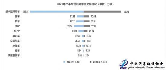 1-8月,全国基本型乘用车共交易688.91万辆,同比增长43.08%;客车交易87.69万辆,同比增长24.05%;载货车交易95.72万辆,同比增长27.35%;SUV交易123.54万辆,同比增长58.98%;MPV交易66.13万辆,同比增长38.23%;交叉型乘用车交易25.65万辆,同比增长28.45%。