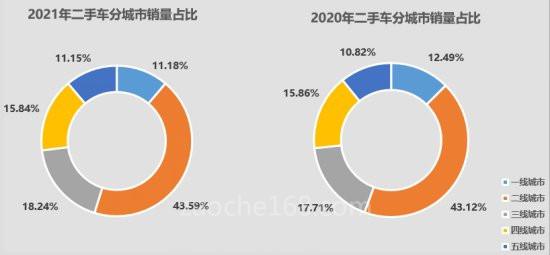 分城市看,1-8月一线城市二手车交易占比11.18%,同比下降1.32%,二线城市占比43.59%,同比增长0.48%,三线城市占比18.24%,同比增长0.53%,四线城市占比15.84%,同比下降0.01%,五线城市占比11.15%,同比增长0.33%。