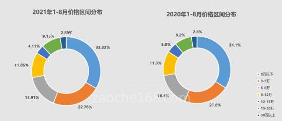 价格方面,1-8月5万元以下价格区间占比达56.09%,同比增长0.26%;5-15万元价格区间占比为31.87%,同比下降1.31%;15万元以上价格区间占比12.04%,同比增长9.45%。