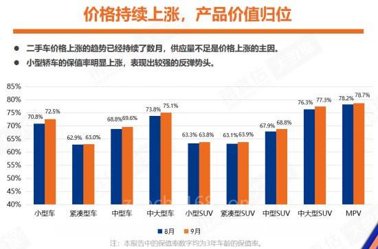 在二手车保值率方面,9月小型车价格涨幅高于整体,“产品供应不足”的情况已经比较严重,C端买家对于车辆的尺寸、性能等要求有所放宽,出行的刚需重新成为购买二手车的主要动因。