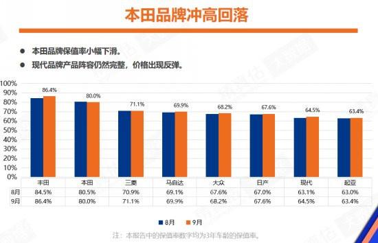 主流合资品牌中,只有本田品牌保值率小幅下滑,流通协会分析是主要受UR-V新车降价影响,说明本田的品牌力与25万元以上的豪华品牌仍有显著差距。另外值得注意的是,现代品牌在主动调整产能,收缩渠道后,供需平衡基本实现。二手车的品质、可靠性、油耗也处于行业上游水准,再加上现代斯库途MPV九月底上市,关注度得到提升,保值率出现反弹。