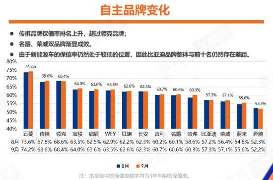 自主品牌方面,上汽乘用车双品牌战略凸显成效,名爵、荣威均进入自主品牌top15,并且逐月上涨,同样产品不同的外观调教定位等元素,可以给消费者带来更多的选择,在当前存量市场的大背景下,定位准确更容易让消费者接受和认可,这种策略也能帮助车企快速吞食市场。另外,传祺品牌保值率上升明显,主要是MPV车型传祺M8的热销带动。