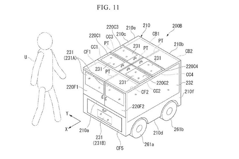 从专利图可知,此类自动驾驶设备看起来像没有在车顶安装雨伞的卖热狗车,其配备了几个大门以及隔间,还有很多小门和货舱。可以猜得到,此类门和隔间都是可以上锁的,只有获得授权的用户才能打开,否则有些年轻的小流氓会一次性将所有包裹拿走。