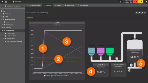 通过历史数据的分析,并及时比较不同点的过程值,可助力优化生产过程。例如,可以测量入口和出口的电导率达到相同水平所需的时间,此外,还可优化采用酸和碱清洗剂进行的高成本冲洗过程等: