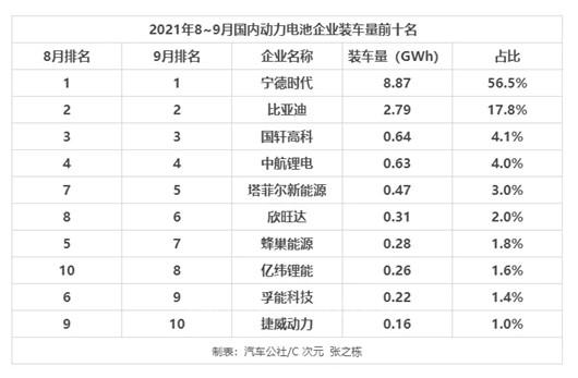 事实上,从刚刚发布的9月份国内动力电池企业装车量来看,一跃占据56.5%市场份额的宁德时代,用比8月份高出近5个百分点的增长,强势捍卫了自己的“王者地位”。