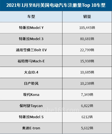 2021年1月至8月,通用雪佛兰Bolt EV的注册量为22,799辆,落后于Model Y和Model 3位居第三名。福特野马Mach-E和大众ID.4这两款新上市的车型分别以15,938辆和10,685辆的注册量位居第四名和第五名。