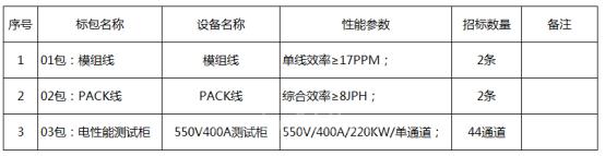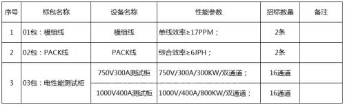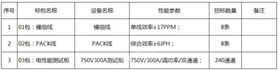 其中模组PACK产线设备采购项目均有模组线、PACK线与测试柜三个分包,共涉及12条模组线、12条PACK线及多个测试柜通道。