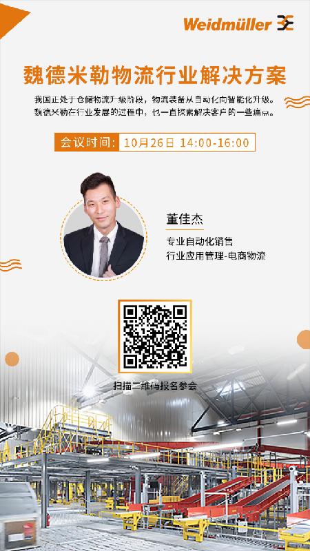 10月26日14:00-16:00,魏德米勒行业应用管理专家将从电商物流行业特征,以及内部物流应用场景需求着手,面向广大行业客户倾情介绍适用于仓储、输送、运输、分拣和处理等核心环节的前瞻性电气联接产品和物联网解决方案,为电商物流行业的生产和运输提供创新之选,帮助客户发现新的商业模式。