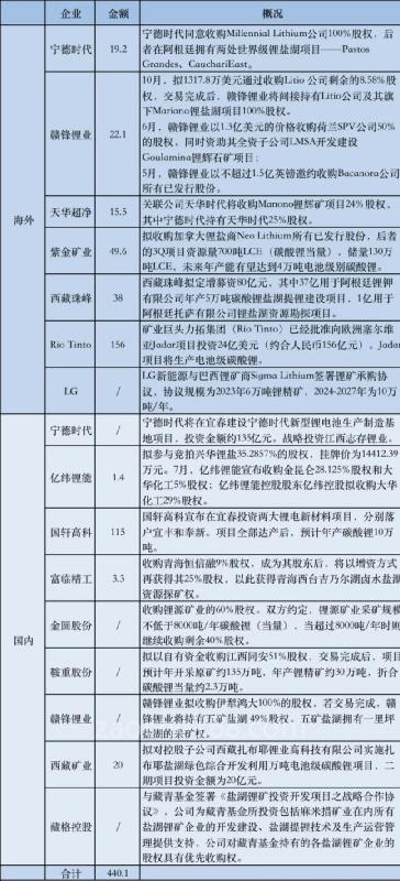 据不完全统计,今年国内外与锂矿争夺与开发的项目达到16个,涉及金额超过440亿元。其中,与海外矿产资源相关的项目7个,国内锂矿资源相关的项目9个。