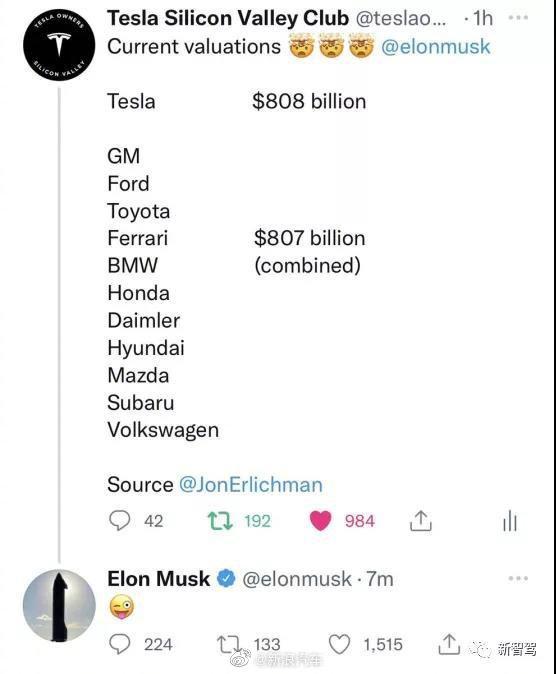 对于特斯拉的坚挺股价,马斯克也表现的也较为得意。今日,马斯克转发了一条推特,其上说明,特斯拉当前的市值已是丰田、大众、宝马、通用等十一家传统车企之和。
