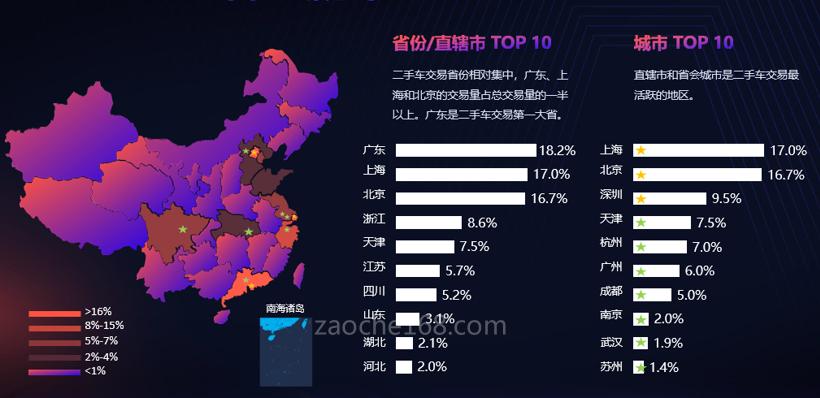 从交易的区域来看,二手车交易主要集中在经济发达的地区。比如,在全国二手车交易量中占比前三的省份依次是广东、上海和北京,这三者的比重之和达到51.9%,从城市来看则是主要集中在经济发达的直辖市和省会城市,在占比前10中有8个城市都是如此。