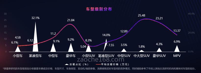 根据具体车型的数据,在整个二手车交易中,均价为6.12万元的紧凑型轿车和均价为7.55万元的紧凑型SUV交易量远远高于其他车型,两者的比重分别为32.1%和14.0%,几乎相当于二手车交易总量的一半。这说明市场保有量、性价比高且经济实用的紧凑型车最受二手车消费者们的青睐。