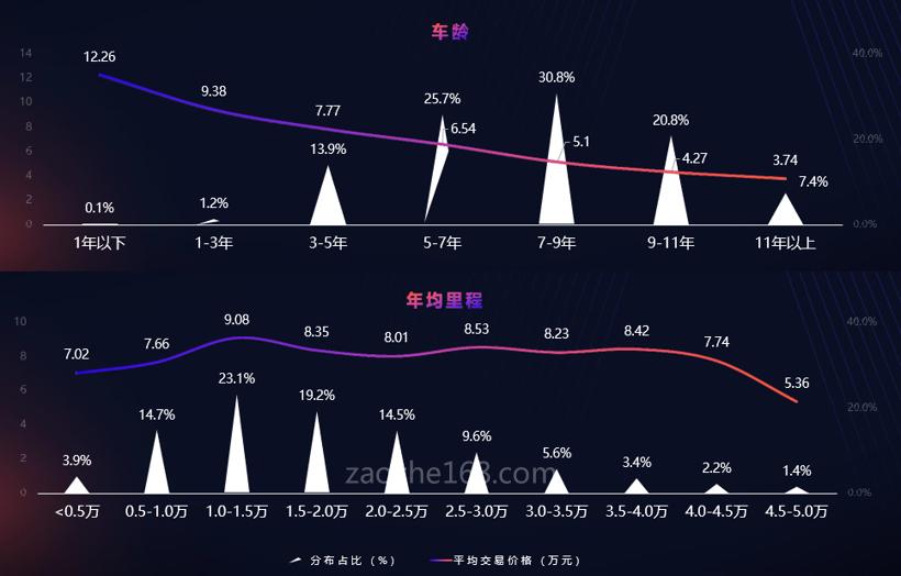 车龄的统计数据显示,7-9年的二手车最为畅销,占到总交易量的30.8%,其次是5-7年,占比为25.7%,9-11年的比重也达到20.8%。