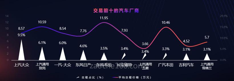 再从各大厂商来看,在二手车市场中份额最高的是上汽大众,近乎占总交易量的10%,上汽通用别克和一汽-大众紧随其后,分别为6.1%和6.0%,其他厂商均低于5%。在交易量前十的厂商中,仅上汽通用五菱和吉利汽车两家自主品牌厂商。交易价格层面,则只有三家车企的成交均价超过10万元,从高到低依次是东风本田11.95万元,上汽通用别克10.59万元和广汽本田10.46万元。