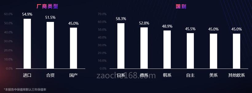 从厂商类型来看,得益于车型的稀缺性和较高的品牌溢价,进口车的保值率最高为54.9%,其次是合资的51.5%,然后才是国产的45.0%。而从国别来看,冠亚军的依旧是日系和德系,且前者的保值率继续大幅领先,三年保值率为58.3%,比后者高出5.5个百分点。接下来是韩系的48.9%,自主以45.5%居于第四。