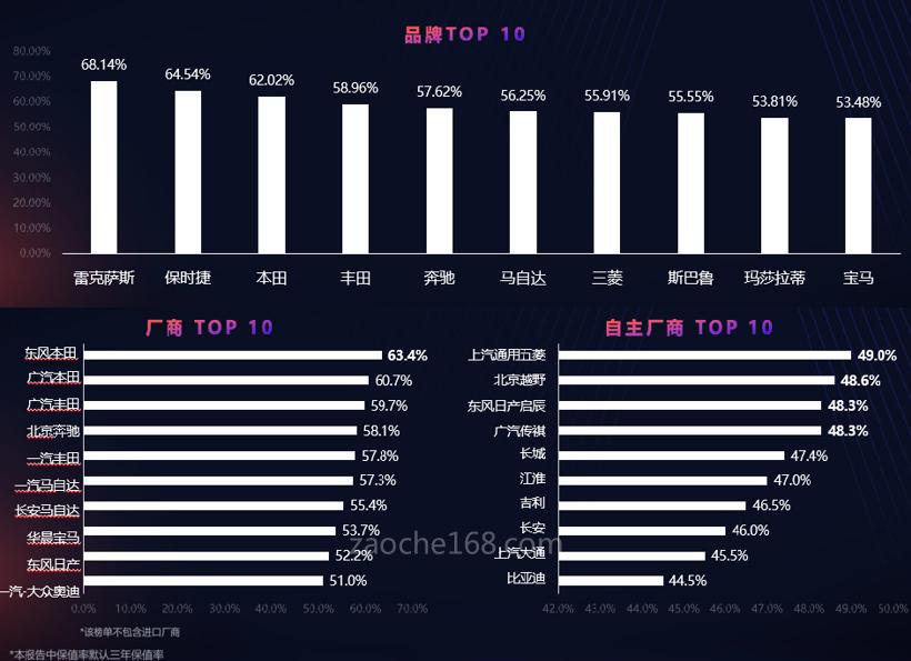 与厂商类型与国别保值率情况相一致,品牌保值率前十要么旗下全部或部分为进口车,要么属于日系阵营或德系阵营。具体来看,雷克萨斯以68.14%继续成为国内保值率最高的品牌,保时捷和本田的保值率也保持在60%以上。